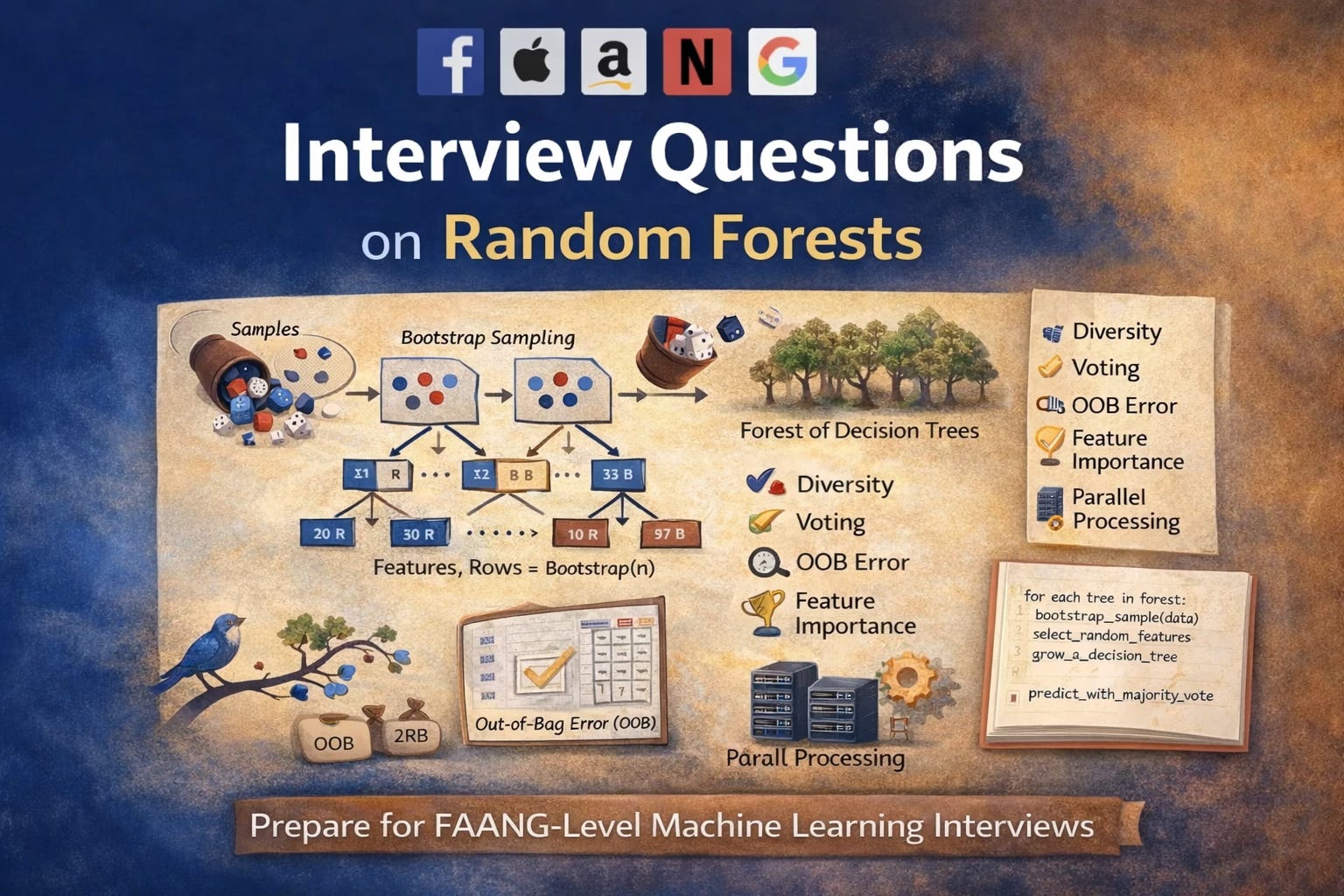 Random Forest is one of those algorithms that looks deceptively simple on the surface but reveals a surprising amount of depth once you dig into it. Because of this, it has become a favorite interview topic at FAANG and other top tech companies not just for checking API knowledge, but for testing how well a candidate understands bias–variance trade-offs, randomness, generalization, and real-world deployment constraints.